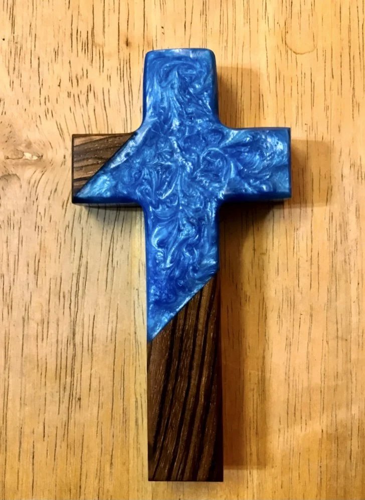 Make it stand out.This is a project I basically started on a whim. Started with zebrawood, then blue resin, added some pearlescent white. Quite happy with this one. If you are too, talk to us about your own unique cross creation.